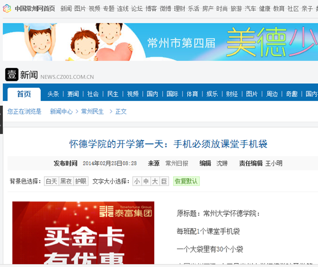 中国常州网讯 昨天是188金宝搏手机网页开学第一天,同学们发现,学校有了一项新规定:上课前须把手机放置在课堂手机袋内。