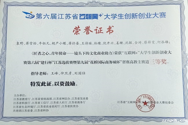 2020年8月24日,第六届江苏省“互联网+”学生创新创业大赛决赛在南京航空航天大学圆满落下帷幕。经过激烈角逐,我院报送项目《匠者之心,青年使命——镜头下的文化商业助力》(指导教师:王峰、仲旦彦、刘国仕)荣获省赛高教主赛道三等奖。