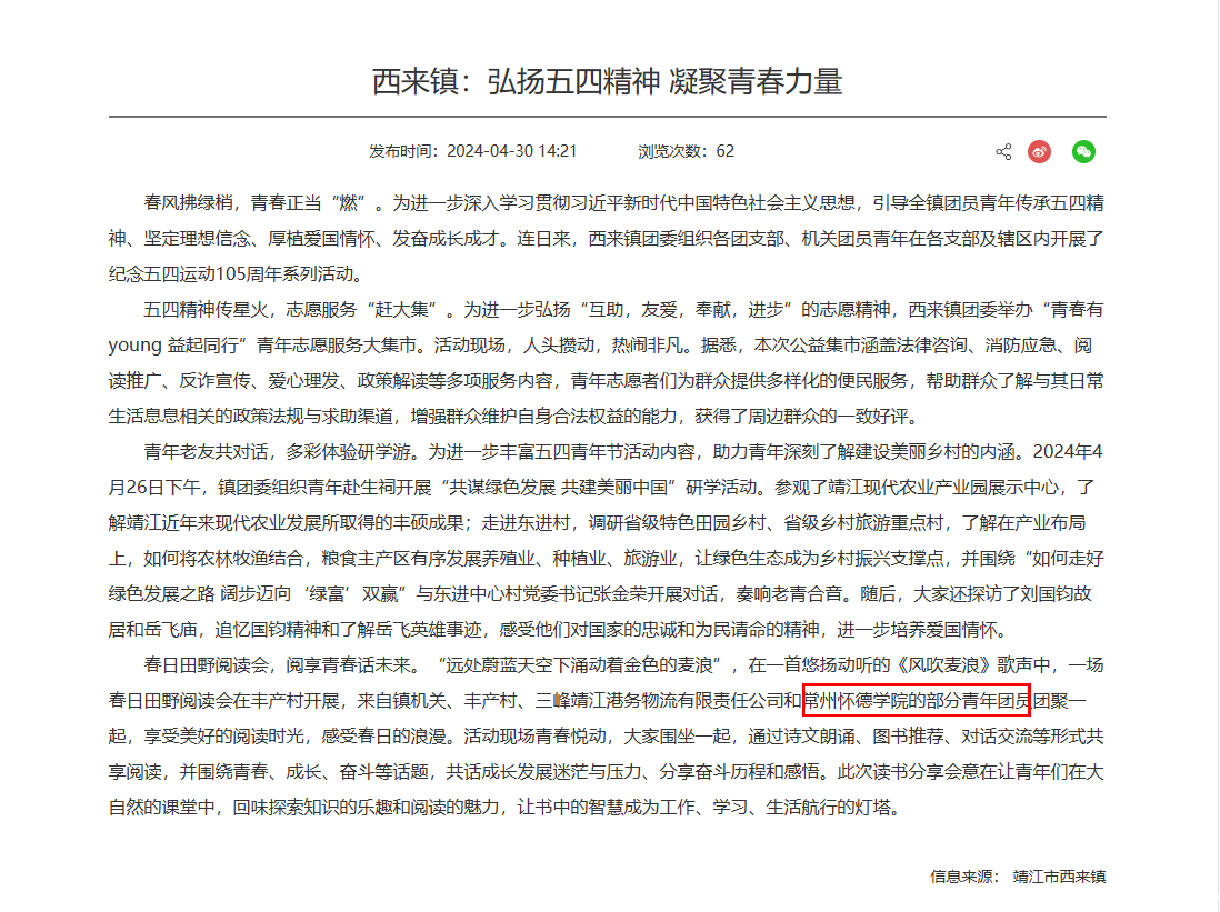 春风拂绿梢,青春正当“燃”。为进一步深入学习贯彻习近平新时代中国特色社会主义思想,引导全镇团员青年传承五四精神、坚定理想信念、厚植爱国情怀、发奋成长成才。连日来,西来镇团委组织各团支部、机关团员青年在各支部及辖区内开展了纪念五四运动105周年系列活动。
